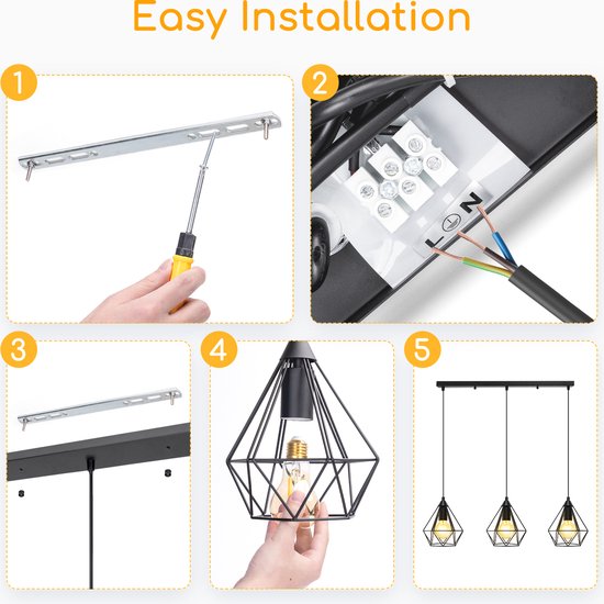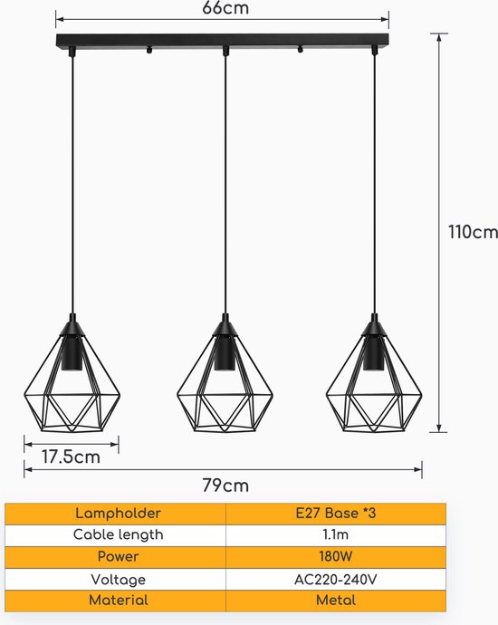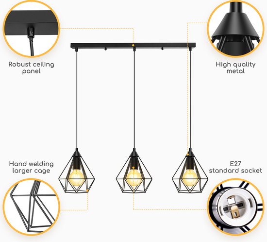 Specificaties: Aigostar 13A4E – Industriële Hanglamp – 3 lichts – E27 fitting – Ø 17.5cm – Eetkamer – Slaapkamer – excl. lichtbronnen – Zwart
