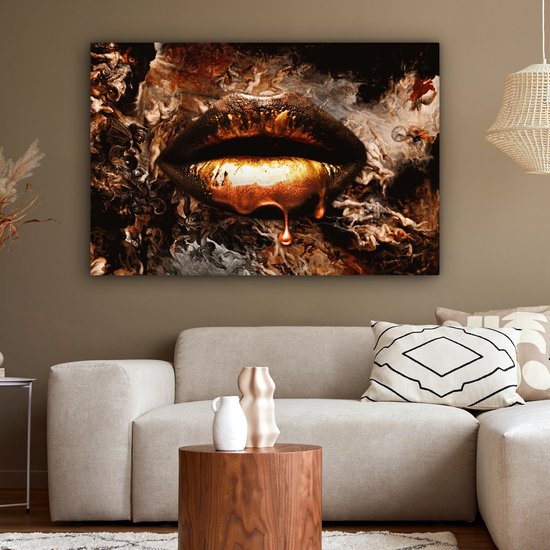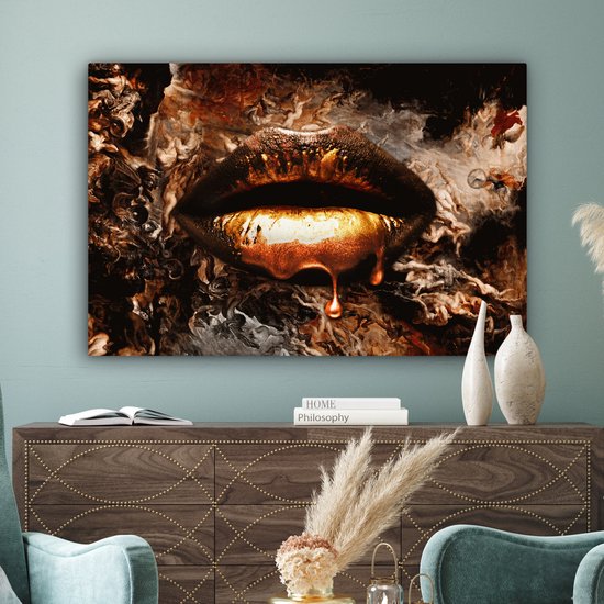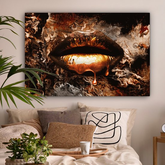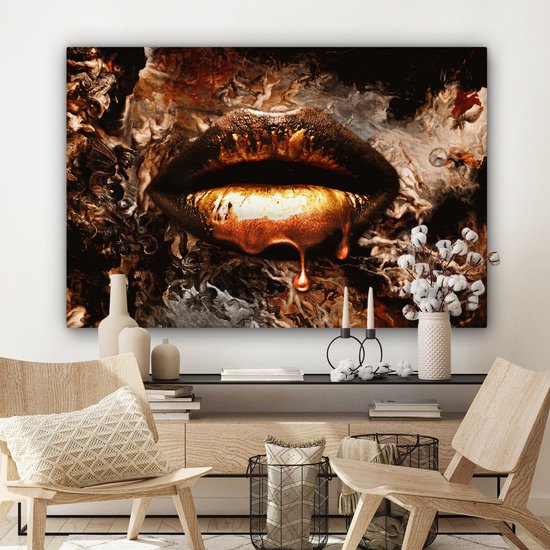 Canvas schilderij – Gouden lippen 140×90 – Kamer decoratie accessoires abstract – Goud kunst schilderijen woonkamer – Wanddecoratie slaapkamer – Muurdecoratie keuken – Wanddoek…