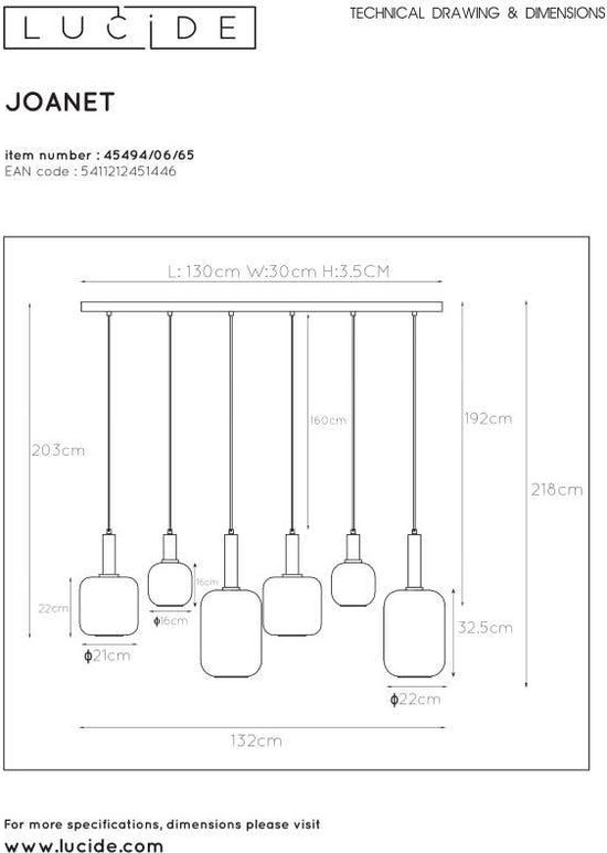 Specificaties: Lucide JOANET – Hanglamp – 6xE27 – Fumé