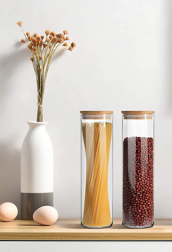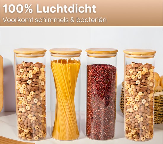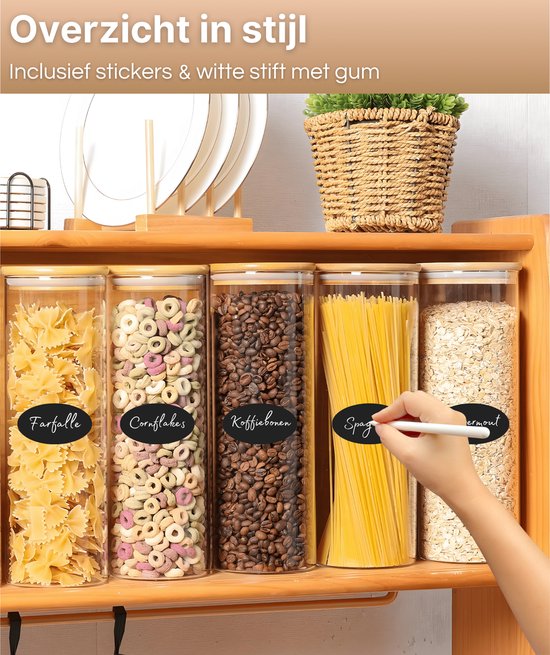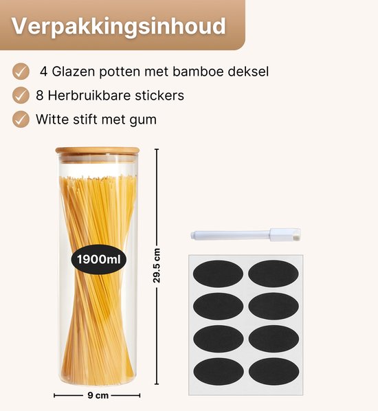 Specificaties: Quality Needz – Voorraadpotten – 4 Delige Set – 1900 ML – Glazen Potjes Met Deksel – BPA-vrij – Gratis Pen & Herschrijfbare Stickers – Snoeppot