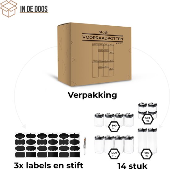 Specificaties: Stosh Voorraadpotten – Snoeppot – Voorraadbussen – Vershouddoos – 14 Stuks – BPA vrij – Kunststof